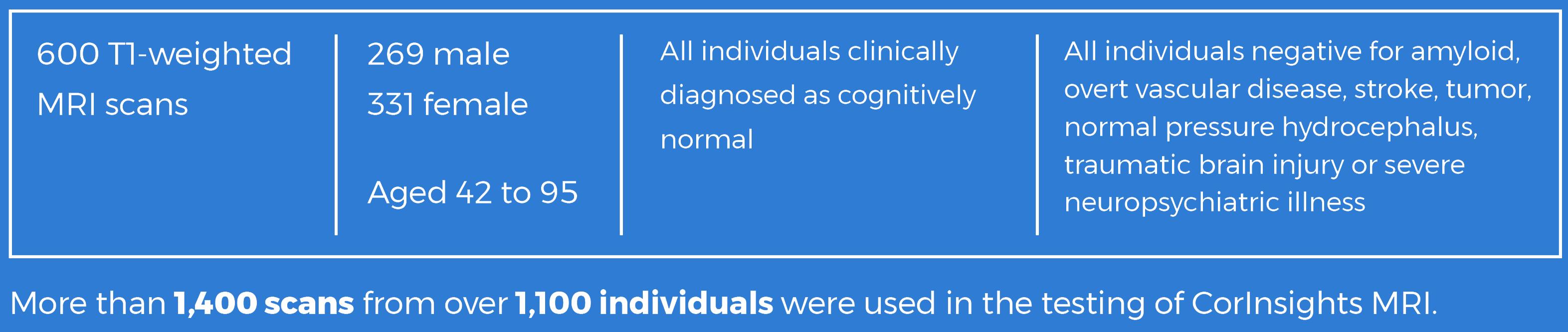 In the development of the CorInsights® MRI normative reference database, data were extensively screened to ensure that CorInsights® MRI normative values are not influenced by disease, and consisted of: