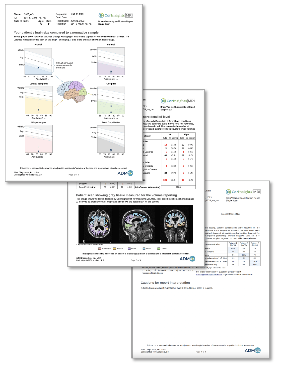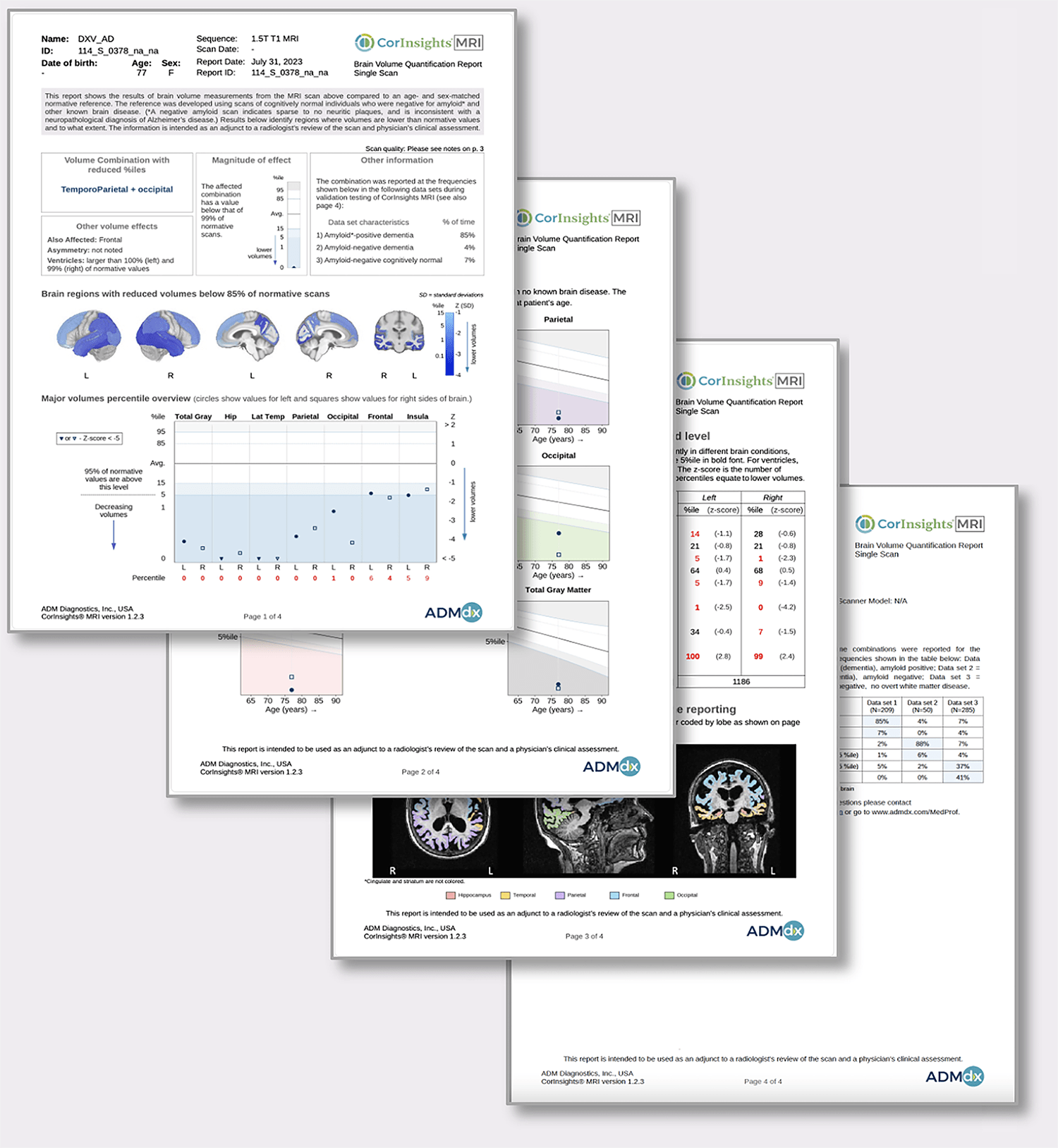 CorInsights® MRI is our FDA-cleared diagnostic report that provides exceptional insights into brain volumes. Numerous published studies have shown that various brain conditions, such as Alzheimer’s disease, are often associated with volume loss in certain brain region combinations. Using a standard MRI scan, our CorInsights® MRI report quantifies which, if any, brain regions have reduced volume compared to an age- and sex-matched normative reference. It translates complexity to clarity by integrating this information into a clear overall view of effects. This insight is intended to aid the medical professional as an adjunct to clinical assessment.
