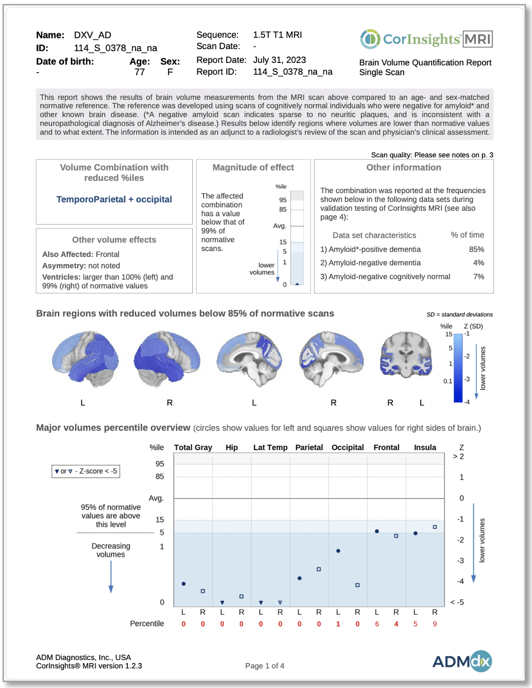 CorInsights® MRI shows the overall picture as well as the detailed quantitative measures that support findings. Shown at left, see on page 1 the overall pattern of effect as a color-coded image and by name, as well as percentile plot and information regarding other attributes.