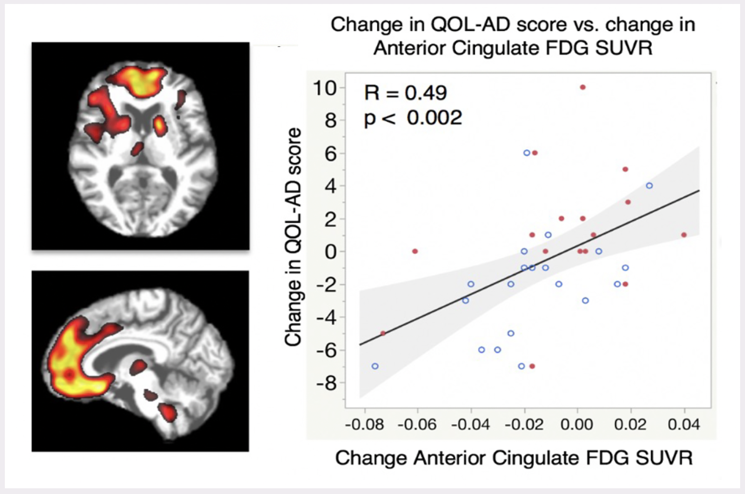 The image at right shows the relationship identified between increased neuronal function measured using FDG PET and improvement in Quality of Life scores.